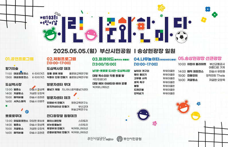 ■ 행사 개요 행사명: 제103회 어린이날 어린이문화한마당 일 시: 2025년 5월 5일(월) 10:00 ~ 17:00 장 소: 부산시민공원 일원(아래 행사지도 참고) 대 상: 어린이 및 가족 누구나
