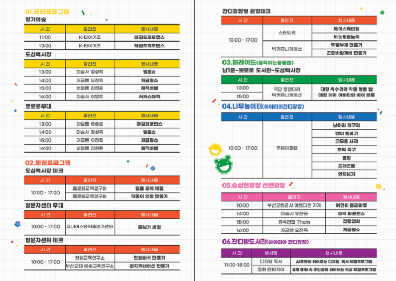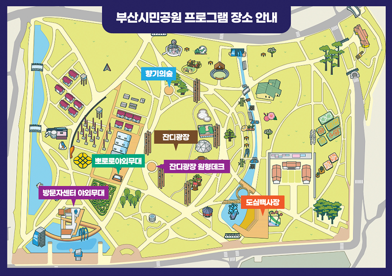 ■ 주요 프로그램 공연 프로그램: 어린이들을 위한 흥미로운 공연 진행 (향기의숲, 도심백사장, 뽀로로무대) 체험 프로그램: 창의력과 감성을 키우는 체험활동 (도심백사장 데크, 방문자센터 무대 및 데크, 잔디광장옆 원형데크) 거리 공연: 공원 곳곳에서 펼쳐지는 즐거운 거리공연 (남1문-뽀로로도서관-도심백사장) 나무놀이터: 자연을 느끼며 자유롭게 뛰어놀 수 있는 특별한 놀이공간 운영 (하야리아 잔디광장)