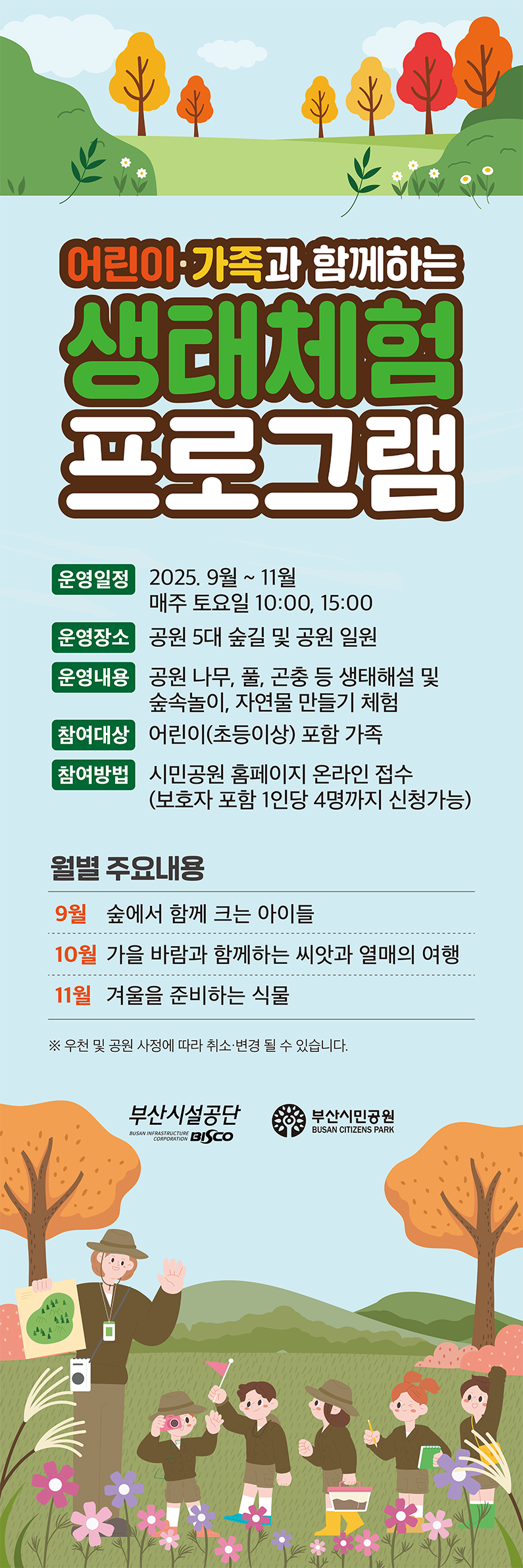 운영일정 2025. 9월 ~ 11월 매주 토요일 10:00, 15:00 ※ 참여시간 확인 필수 운영장소 공원 5대 숲길 및 공원 일원 운영내용 공원 나무, 풀, 곤충 등 생태해설 및 숲속놀이 자연물 만들기 체험 참여대상 어린이(초등이상) 포함 가족 참여방법 부산시민공원 홈페이지 온라인 접수(보호자 포함 1인당 4명까지 신청가능)