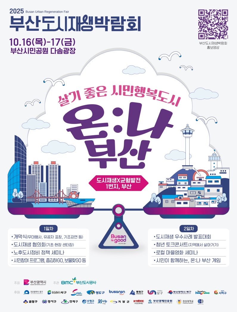 행사명: 2025 부산도시재생박람회 (Busan Urban Regeneration Fair) 일시: 2025년 10월 16일(목) ~ 10월 17일(금) 장소: 부산시민공원 다솜광장 주최: 부산광역시 주관: 부산도시공사 후원: 국토교통부, 한국토지주택공사 등 다수 기관 🗓 프로그램 주요 일정 ✔ 1일차 (10/16 목요일) 개막식 (무대행사, 유공자 표창, 기조강연 등) 도시재생 협의회 (기초·현장 센터장 참여) 노후도시정비 정책 세미나 시민참여 프로그램: 즐길하GO, 보물찾GO ✔ 2일차 (10/17 금요일) 도시재생 우수사례 발표대회 청년 토크콘서트 – 지역에서 살아가기 로컬 마을영화 세미나 시민참여 이벤트: 온:나 부산 게임 |