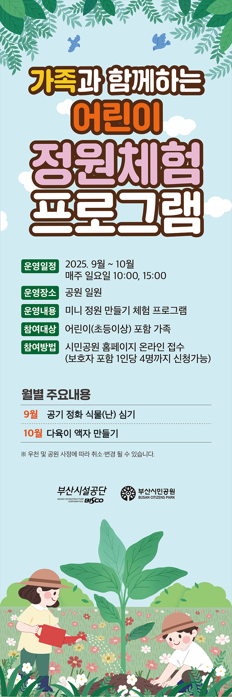 운영일정 2025. 9월 ~ 10월 매주 일요일 10:00, 15:00 ※ 참여시간 확인 필수 운영장소 공원 일원 운영내용 미니 정원 만들기 체험 프로그램 참여대상 어린이(초등이상) 포함 가족 참여방법 부산시민공원 홈페이지 온라인 접수(보호자 포함 1인당 4명까지 신청가능)